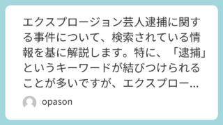 未分類 エクスプロージョン芸人逮捕に関する事件について、検索されている情報を基に解説します。特に、「逮捕」というキーワードが結びつけられることが多いですが、エクスプロージョンのメンバーに関しては過去に逮捕歴はなく、事件は書類送検にとどまっていました。