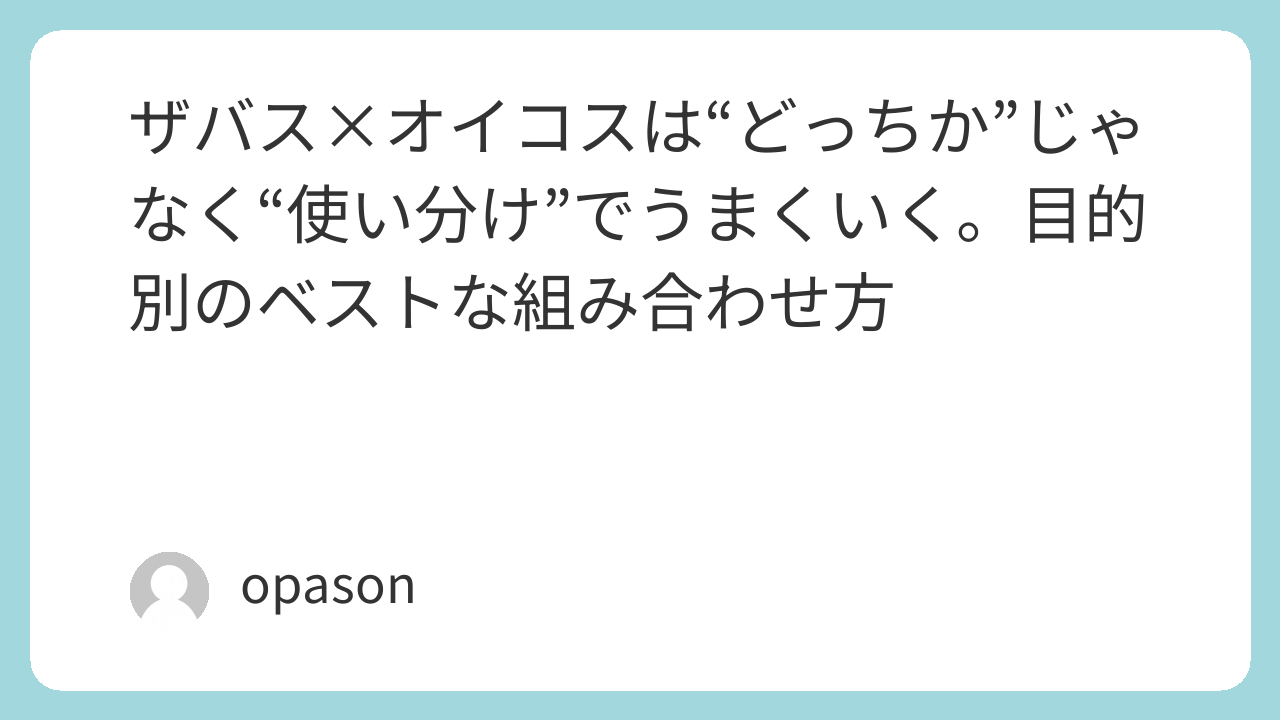 「ザバス オイコス」で迷うときは、どっちが優れているかで考えるより、続けやすい導線を作る方が早いです。忙しい日はザバスで“確保”、間食や置き換えはオイコスで“満足感”、筋トレ後は飲んでから一日の中で積む。この切り替えができると、たんぱく質の摂取が努力じゃなく“習慣”に近づきます。今日から始めるなら、まずは自分が一番つまずきやすい時間帯を決めて、そこに[ザバス MILK PROTEIN 脂肪0 チョコレート風味 200ml](https://www.amazon.co.jp/s?k=%E3%82%B6%E3%83%90%E3%82%B9+MILK+PROTEIN+%E8%84%82%E8%82%AA0+%E3%83%81%E3%83%A7%E3%82%B3%E3%83%AC%E3%83%BC%E3%83%88%E9%A2%A8%E5%91%B3+200ml&tag=opason-22)か[オイコス ヨーグルト プレーン 砂糖不使用](https://www.amazon.co.jp/s?k=%E3%82%AA%E3%82%A4%E3%82%B3%E3%82%B9+%E3%83%A8%E3%83%BC%E3%82%B0%E3%83%AB%E3%83%88+%E3%83%97%E3%83%AC%E3%83%BC%E3%83%B3+%E7%A0%82%E7%B3%96%E4%B8%8D%E4%BD%BF%E7%94%A8&tag=opason-22)を置くところからで十分です。