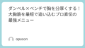 • 実践テクニック: ダンベルを握る手の力はパワーグリップなどで補助し、極力抜きます。その代わり、自分の「二の腕(上腕)」で胸を潰すように、肘と肘を近づけるイメージで動作してみてください。これだけで、収縮時の胸の「ギュッ」という感覚が激変します。