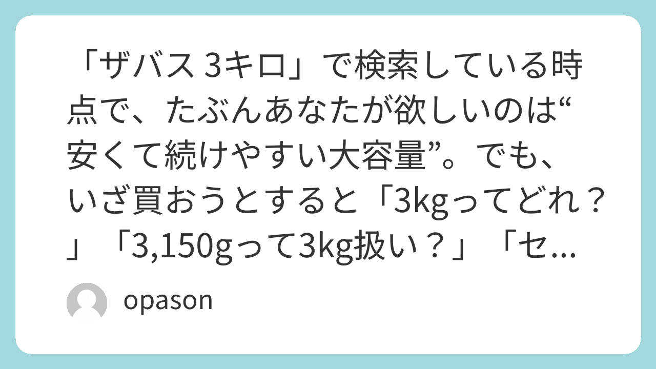 最後に、購入前の最終チェックをひとつだけ。商品名や見出しに「3kg」と書いてあっても、実際は3,150gだったり、980g×3の合計だったり、2,520gの大袋だったりします。大事なのは、数字そのものより「あなたが何か月で飲み切るか」と「保存ストレスに耐えられるか」。その答えが“はい”なら、3kg級は買う回数が減って、習慣が一段ラクになります。迷っているなら、まずは比較枠として明治 ザバス ホエイプロテイン100 リッチショコラ味 2520g(3kg級の比較対象)(https://www.amazon.co.jp/s?k=%E6%98%8E%E6%B2%BB+%E3%82%B6%E3%83%90%E3%82%B9+%E3%83%9B%E3%82%A8%E3%82%A4%E3%83%97%E3%83%AD%E3%83%86%E3%82%A4%E3%83%B3100+%E3%83%AA%E3%83%83%E3%83%81%E3%82%B7%E3%83%A7%E3%82%B3%E3%83%A9%E5%91%B3+2520g&tag=opason-22)を見つつ、味の方向性が固まったら【Amazon.co.jp 限定】ザバス ホエイプロテイン100 ココア味 3150g(150食分)(https://www.amazon.co.jp/s?k=%E3%80%90Amazon.co.jp+%E9%99%90%E5%AE%9A%E3%80%91%E3%82%B6%E3%83%90%E3%82%B9+%E3%83%9B%E3%82%A8%E3%82%A4%E3%83%97%E3%83%AD%E3%83%86%E3%82%A4%E3%83%B3100+%E3%82%B3%E3%82%B3%E3%82%A2%E5%91%B3+3150g+150%E9%A3%9F%E5%88%86&tag=opason-22)のような大容量へ、という流れがいちばん事故が少ないです。