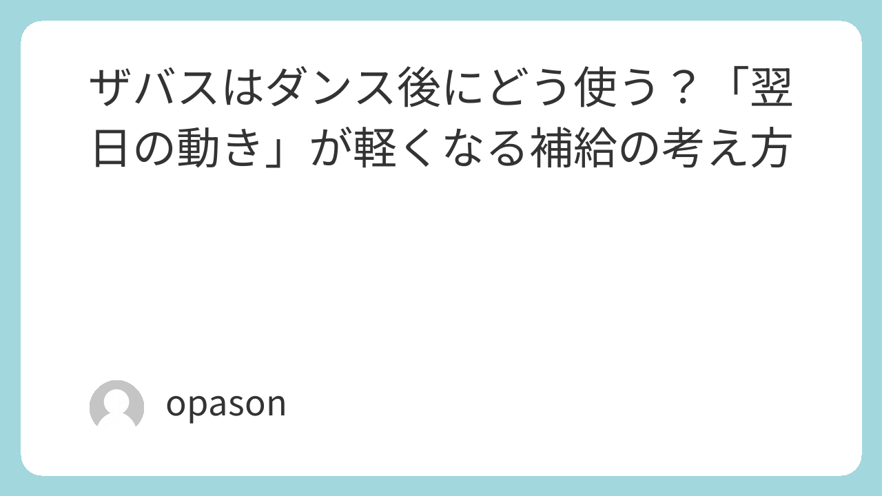 ザバスをダンス後に取り入れる価値は、特別な魔法というより、練習後の空白を埋めて回復の土台を作れるところにあります。練習直後に飲める(ザバス)MILK PROTEIN 脂肪0 ココア風味 200ml(https://www.amazon.co.jp/s?k=%E3%82%B6%E3%83%90%E3%82%B9+MILK+PROTEIN+%E8%84%82%E8%82%AA0+%E3%82%B3%E3%82%A2%E9%A2%A8%E5%91%B3+200ml&tag=opason-22)で“ゼロを作らない”。家ではザバス ホエイプロテイン100 リッチショコラ味 980g(https://www.amazon.co.jp/s?k=%E3%82%B6%E3%83%90%E3%82%B9+%E3%83%9B%E3%82%A8%E3%82%A4%E3%83%97%E3%83%AD%E3%83%86%E3%82%A4%E3%83%B3100+%E3%83%AA%E3%83%83%E3%83%81%E3%82%B7%E3%83%A7%E3%82%B3%E3%83%A9%E5%91%B3+980g&tag=opason-22)やザバス ソイプロテイン100 ココア味 945g(https://www.amazon.co.jp/s?k=%E3%82%B6%E3%83%90%E3%82%B9+%E3%82%BD%E3%82%A4%E3%83%97%E3%83%AD%E3%83%86%E3%82%A4%E3%83%B3100+%E3%82%B3%E3%82%B3%E3%82%A2%E5%91%B3+945g&tag=opason-22)でベースを整える。食事が遅れる日はザバス プロテインバー(https://www.amazon.co.jp/s?k=%E3%82%B6%E3%83%90%E3%82%B9+%E3%83%97%E3%83%AD%E3%83%86%E3%82%A4%E3%83%B3%E3%83%90%E3%83%BC&tag=opason-22)でつなぐ。粉を続けるならザバス プロテインシェイカー 500mL(https://www.amazon.co.jp/s?k=%E3%82%B6%E3%83%90%E3%82%B9+%E3%83%97%E3%83%AD%E3%83%86%E3%82%A4%E3%83%B3%E3%82%B7%E3%82%A7%E3%82%A4%E3%82%AB%E3%83%BC+500mL&tag=opason-22)で手間を減らす。