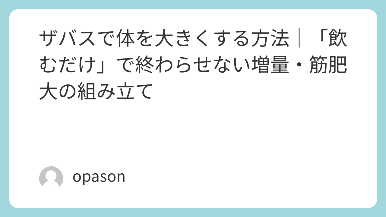 この3つが揃ってくると、ザバスは「飲んでいるのに変わらない」から「飲んでいるから伸びる」に変わります。最初は完璧を目指さなくて大丈夫です。筋トレ後に「ザバス ホエイプロテイン100 リッチショコラ味」(https://www.amazon.co.jp/s?k=%E3%82%B6%E3%83%90%E3%82%B9%20%E3%83%9B%E3%82%A8%E3%82%A4%E3%83%97%E3%83%AD%E3%83%86%E3%82%A4%E3%83%B3100%20%E3%83%AA%E3%83%83%E3%83%81%E3%82%B7%E3%83%A7%E3%82%B3%E3%83%A9%E5%91%B3&tag=opason-22)を一杯、忙しい日に「ザバス ミルクプロテイン 脂肪0 15g」(https://www.amazon.co.jp/s?k=%E3%82%B6%E3%83%90%E3%82%B9%20%E3%83%9F%E3%83%AB%E3%82%AF%E3%83%97%E3%83%AD%E3%83%86%E3%82%A4%E3%83%B3%20%E8%84%82%E8%82%AA0%2015g&tag=opason-22)を一本、増量が停滞するなら「ザバス ウェイトアップ バナナ風味」(https://www.amazon.co.jp/s?k=%E3%82%B6%E3%83%90%E3%82%B9%20%E3%82%A6%E3%82%A7%E3%82%A4%E3%83%88%E3%82%A2%E3%83%83%E3%83%97%20%E3%83%90%E3%83%8A%E3%83%8A%E9%A2%A8%E5%91%B3&tag=opason-22)を補食で使う。これだけでも、体を大きくするための“穴”はかなり塞がります。