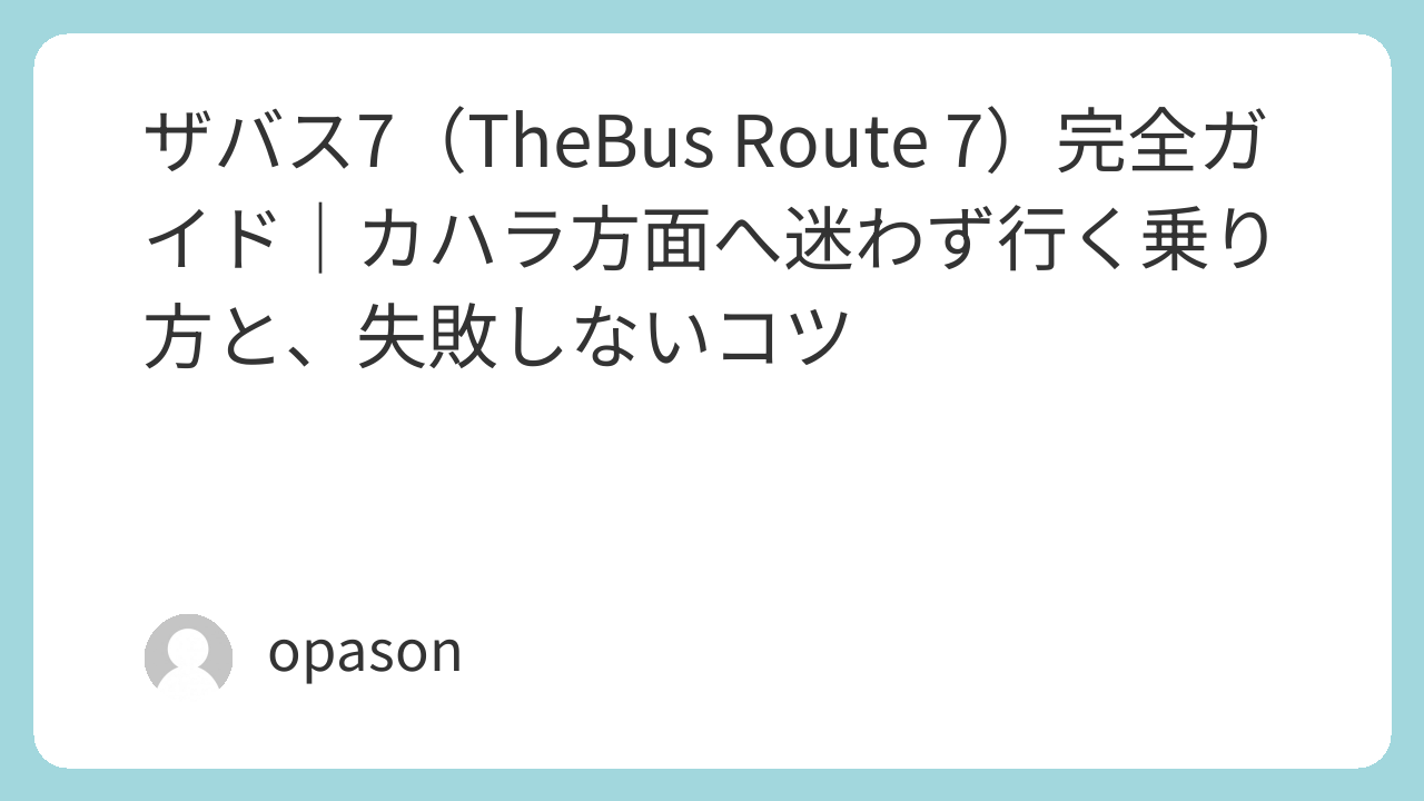 旅先のバス移動は、地図をにらむより「どの言葉を見たら正解か」を持っている方が強いです。ザバス7なら「7 KAHALA MALL」を合言葉にして、来た車両の表示と一致するかだけ確認する。このルールにすると、英語が得意じゃなくても判断が速くなります。英語表記やアナウンスが不安なら、移動中にサッと見返せる https://www.amazon.co.jp/s?k=%E6%97%85%E8%A1%8C%E8%8B%B1%E4%BC%9A%E8%A9%B1+%E3%83%8F%E3%83%AF%E3%82%A4&tag=opason-22 の「旅行英会話(ハワイ)」があると、気持ちの余裕が生まれます。バスで使う英語は難しい表現より、「ここで降ります」「このバスは○○行きですか」みたいな短文が役に立ちます。