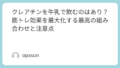 - 水分補給: クレアチンは体内の水分を細胞に引き込む性質があるため、スポーツドリンクや水はいつもより多めに飲むのが鉄則です。