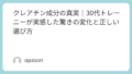 もしクレアチンを飲んで明らかに顔が腫ぼったいと感じるなら、それはサプリメントのせいではなく、同時に摂取している塩分の過多や、腎機能への一時的な負担、あるいは圧倒的な水分不足が原因かもしれません。