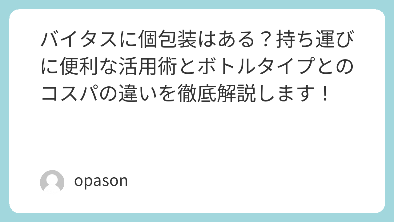 - 究極の省スペース化: 出張の多い私にとって、バイタスのボトルをカバンに入れるのは死活問題。個包装なら、手帳の隙間や財布のカード入れにすら忍ばせられます。