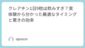 クレアチン9ccは、およそ5g弱という認識で間違いありません。日々のトレーニング効果を最大化するためにも、まずは「すりきり1杯」を基本に、自分の体調や摂取サイクルに合わせて微調整していきましょう。