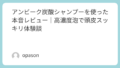アンビーク炭酸シャンプーを実際に使ってみた感想ですが、まず驚いたのはその泡立ちの良さです。シャンプーを手に取ると、濃密な泡があっという間にできあがり、手のひらで簡単に広げられます。炭酸シャンプーは泡の「シュワシュワ感」が特徴的ですが、このシャンプーの場合、炭酸の刺激は控えめ。むしろ、泡の柔らかさと心地よい洗い心地に感動しました。