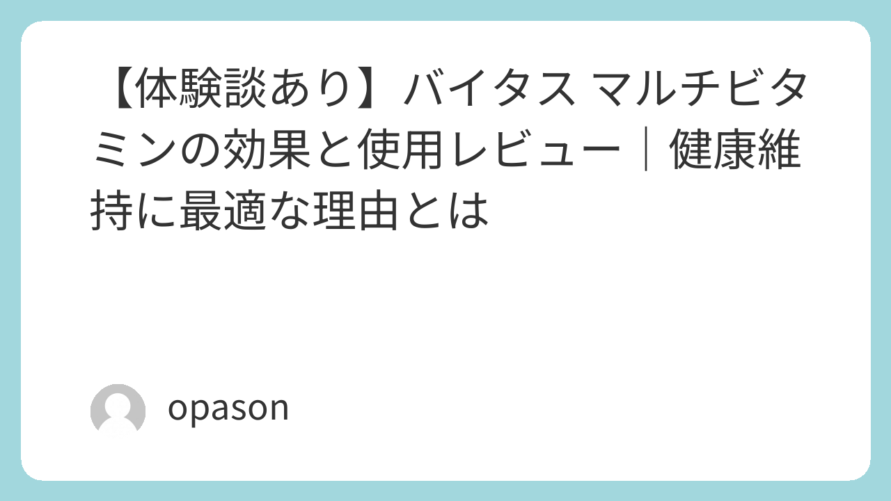 バイタス マルチビタミンは、忙しい生活を送る現代人にとって非常に役立つサプリメントです。エネルギー不足や免疫力の低下を感じている方、健康維持に気を使っている方にとって、日常的に取り入れることで効果を実感できるでしょう。実際の使用者の体験談にもある通り、バイタスのマルチビタミンは、多忙な日常をサポートする心強い味方となります。自分の健康をサポートしたいと考えている方には、ぜひ試してみてほしいアイテムです。
