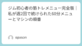2日目は、チェストプレス、ショルダープレス、腹筋系のマシンを中心にして、最後に軽めの有酸素運動を入れます。1日目より上半身の前側を使うので、同じ週2回でも内容に変化が出て飽きにくかったです。