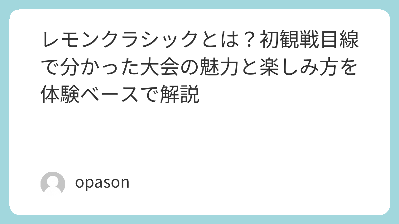 私がレモンクラシックについて調べて感じたのは、この大会は観戦者にも出場者にも開かれた、入口として非常に優秀な大会だということです。競技としての見応えがありながら、初心者を置いていかない。情報だけで終わらず、会場に行ってみたくなる。そこに大きな魅力があります。