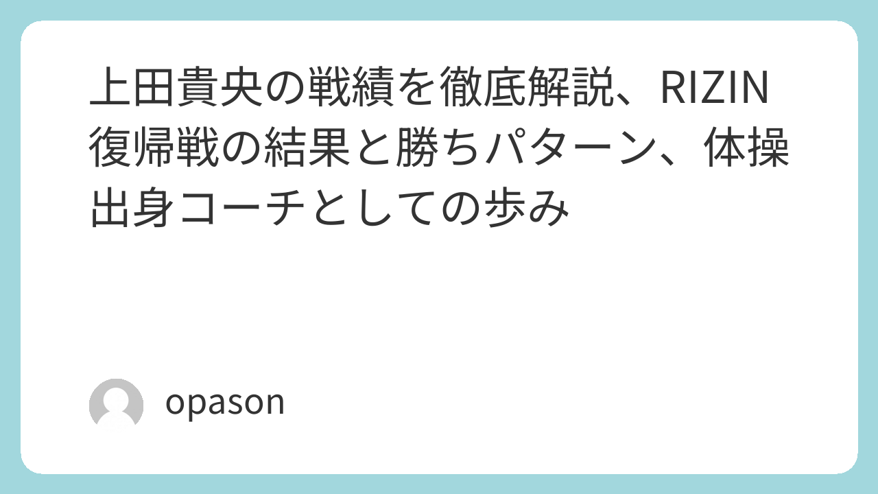 上田貴央の戦績を一通り調べてみて、最終的に強く感じたのは、数字だけで評価するとこの選手の魅力を取りこぼすということでした。通算成績を見る、一本勝ちの内訳を見る、RIZIN復帰戦の結果を見る。もちろんそのどれも重要です。ですが、本当に読み応えのある記事にするなら、その数字の裏側にある体操時代の経験、関節技に表れた個性、ブランクを経た復帰、そして今の指導者としての立場まで含めて読むべきです。